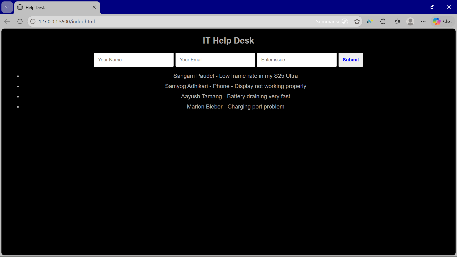 A simple Help Desk web app that lets users submit issues, displays reported problems and confirms successful email notifications through an interactive and user-friendly interface.